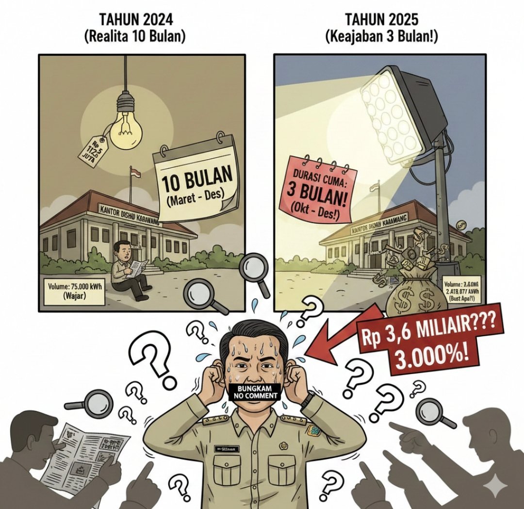 • Volume Listrik: Lonjakan kebutuhan daya dari 75 ribu kWh menjadi 2,4 juta kWh secara tiba-tiba tanpa penjelasan peruntukan yang jelas (apakah pergeseran dari listrik kantor ke PJU atau lainnya).