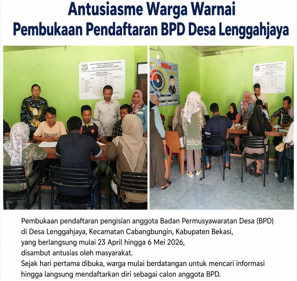 BEKASI, NarasiKita.ID — Pembukaan pendaftaran pengisian anggota Badan Permusyawaratan Desa (BPD) di Desa Lenggahjaya, Kecamatan Cabangbungin, Kabupaten Bekasi, yang berlangsung mulai 23 April hingga 6 Mei 2026, disambut antusias oleh masyarakat. Sejak hari pertama dibuka, warga mulai berdatangan untuk mencari informasi hingga langsung mendaftarkan diri sebagai calon anggota BPD.