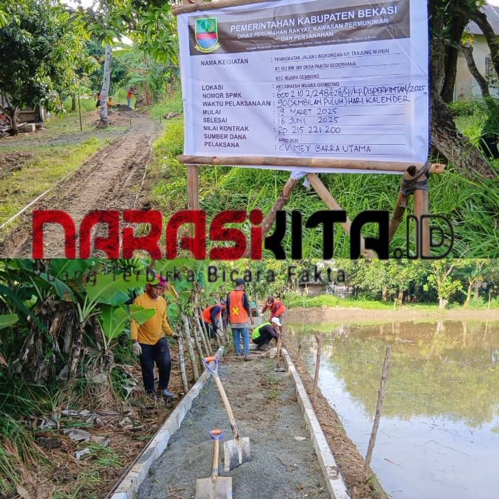 BEKASI, NarasiKita.ID – Proyek Peningkatan Jalan Lingkungan (Jaling) di Kampung Tanjungnuhun RT 002 RW 001, Desa Pantai Sederhana, Kecamatan Muaragembong, Kabupaten Bekasi, diduga dikerjakan asal-asalan. Proyek yang dibiayai dari APBD 2025 senilai Rp215 juta lebih ini berada di bawah tanggung jawab Dinas Perumahan Rakyat, Kawasan Permukiman dan Pertanahan (PRKPP) Kabupaten Bekasi, dan dilaksanakan oleh CV. Mey Barra Utama.
