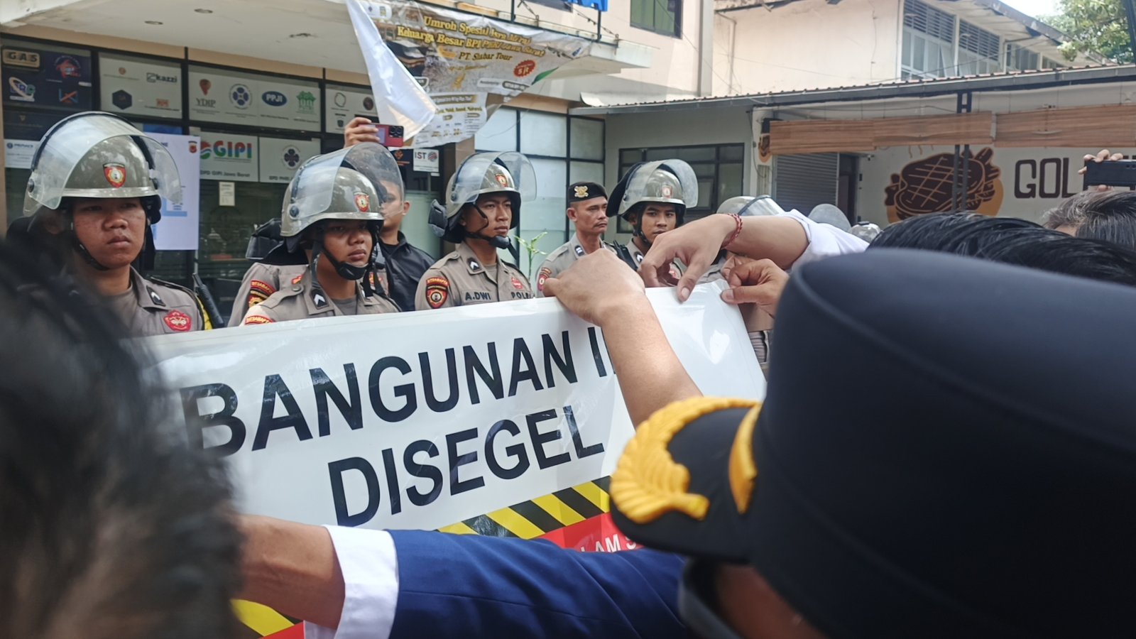 Aksi yang diwarnai orasi dan pemasangan spanduk bertuliskan “GEDUNG KADIN JAWA BARAT DALAM STATUS QUO” serta poster “BANGUNAN INI DISEGEL” ini mendapat pengamanan ketat dari aparat kepolisian. Akses Jalan Sukabumi sempat ditutup sementara saat massa melakukan aksi penyegelan.
