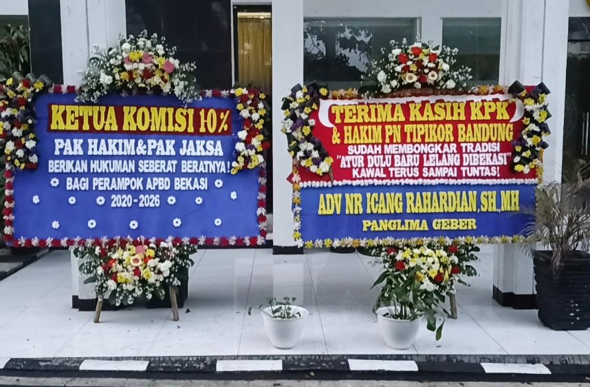 BANDUNG, NarasiKita.ID – Gelombang dukungan publik terhadap penegakan hukum dalam kasus dugaan korupsi APBD Bekasi terus menguat. Sejumlah karangan bunga berjajar di halaman Pengadilan Negeri Tipikor Bandung sebagai simbol apresiasi masyarakat kepada Komisi Pemberantasan Korupsi (KPK), Jaksa Penuntut Umum, dan Majelis Hakim yang tengah menangani perkara tersebut.