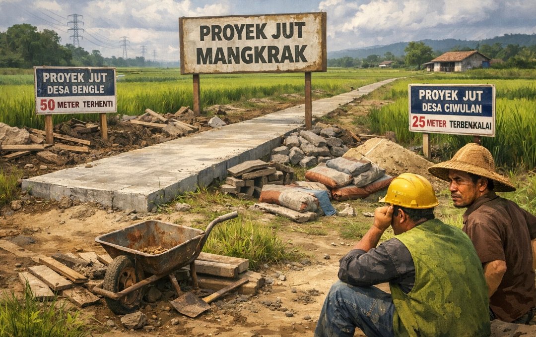 Namun kenyataannya di lapangan jauh dari harapan. Di Desa Ciwulan, pekerjaan baru mencapai 25 meter, sementara di Dusun Bengle hanya sekitar 50 meter. Selebihnya terbengkalai tanpa pekerja, tanpa material, dan tanpa tanda-tanda kelanjutan pekerjaan.