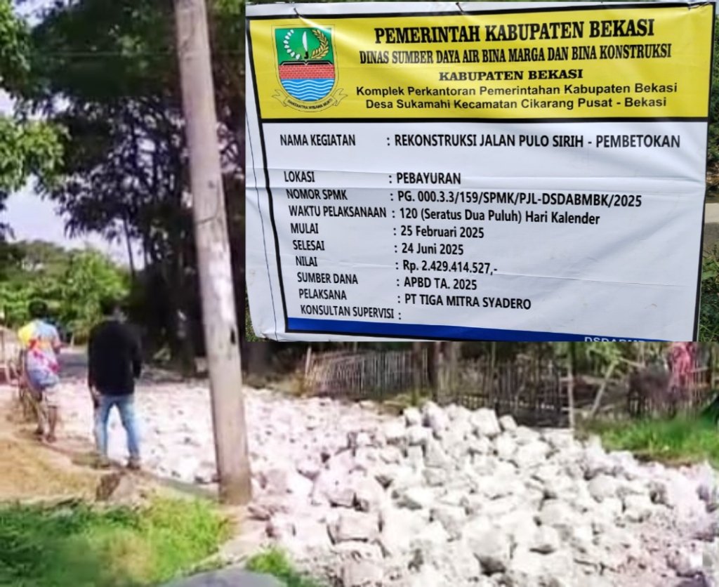 BEKASI, NarasiKita.ID – Proyek Rekonstruksi Jalan Pulo Sirih–Pembetokan yang terletak di Desa Sukajadi, Kecamatan Sukakarya, Kabupaten Bekasi, menuai sorotan publik. Proyek yang menelan anggaran hingga Rp2,42 miliar dari APBD Tahun Anggaran 2025 itu diduga menggunakan limbah beton bekas jalan sebagai material Lapis Pondasi Bawah (LPB).