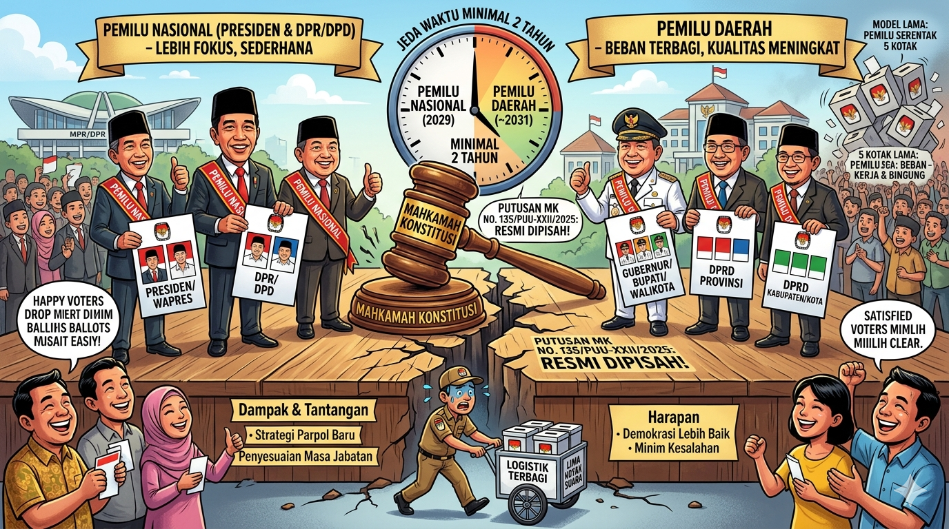 Putusan tersebut tertuang dalam Putusan MK Nomor 135/PUU-XXII/2025 yang bersifat final dan mengikat. Dengan demikian, skema pemilu serentak lima kotak suara yang diterapkan sejak 2019 dipastikan tidak lagi digunakan pada pemilu mendatang.
