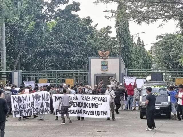 BEKASI NarasiKita.ID – Warga Kabupaten Bekasi, Jawa Barat, menggelar aksi damai di depan gerbang Kompleks Plaza Pemerintahan Kabupaten Bekasi untuk menyatakan dukungan penuh terhadap pengesahan Revisi Undang-Undang Tentara Nasional Indonesia (UU TNI) Tahun 2024 menjadi UU TNI Tahun 2025.